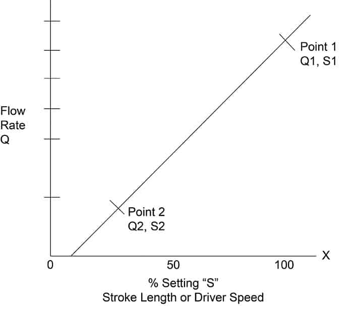 3、計量泵流量與沖程特性曲線呈線性關系(圖3)。然而,它不一定成比例,因為 50% 的沖程設置可能不等于 50% 的流量。這是因為校準線可能不會同時通過兩個軸上的 0。通過在兩個沖程設置下測量流量,繪制兩個點并通過它們畫一條直線,可以準確預測其他流量與沖程的關系。